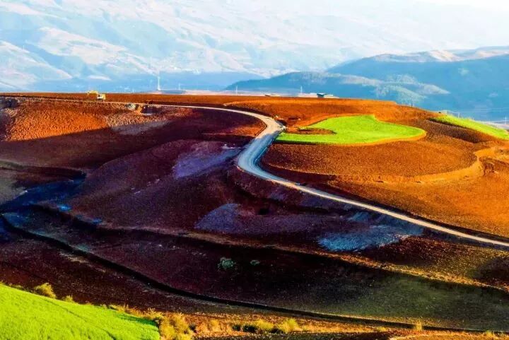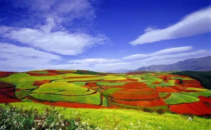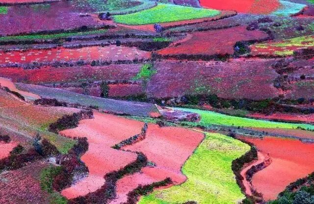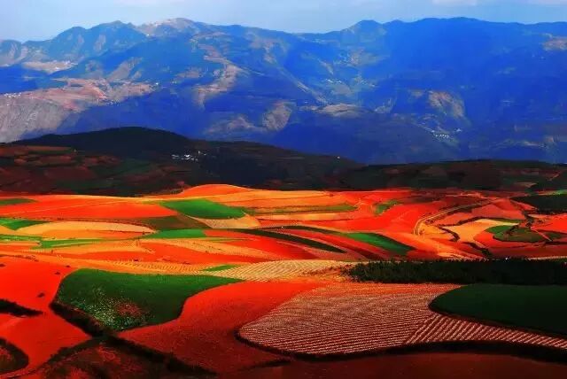 东川红土地是一片壮观的土地被认为是全世界除巴西里约热内卢外最有气势的红土地,五彩的色块就像上帝打翻的调色板。