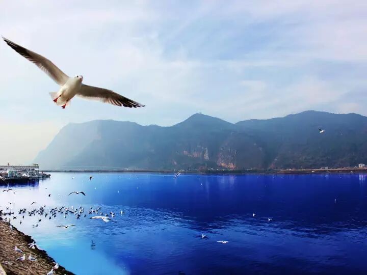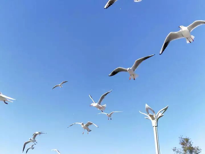 这一路有蓝的天、白的云、热闹的红嘴鸥,伴着青山和绿水,尤其在公路峰回路转之时,观望滇池有一种大海扑面而来的感觉!就是这么奇妙!
