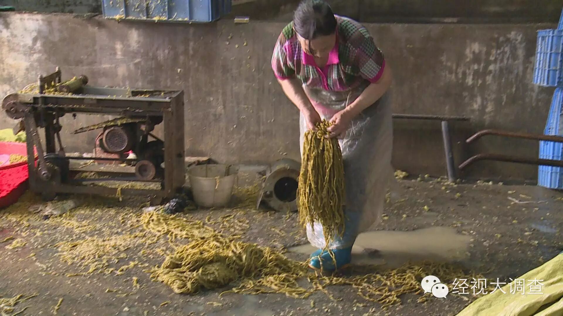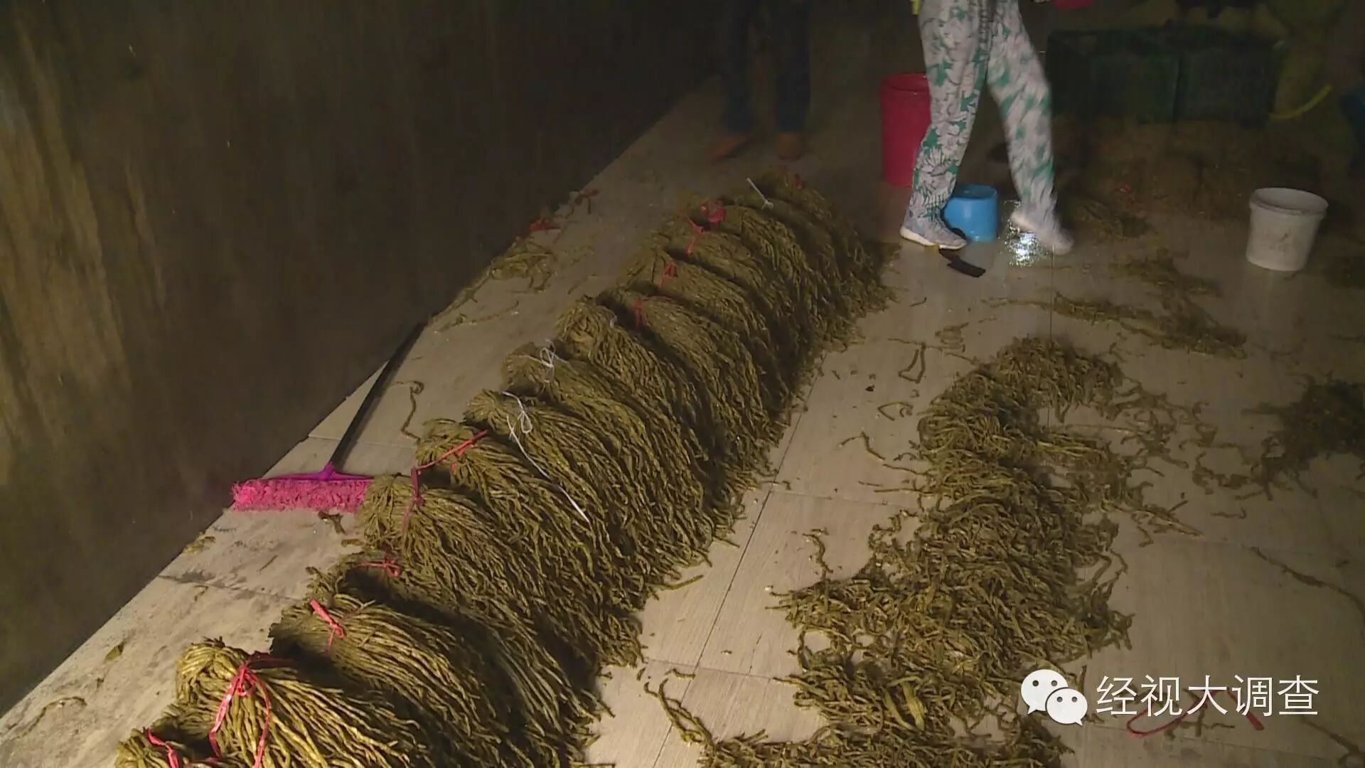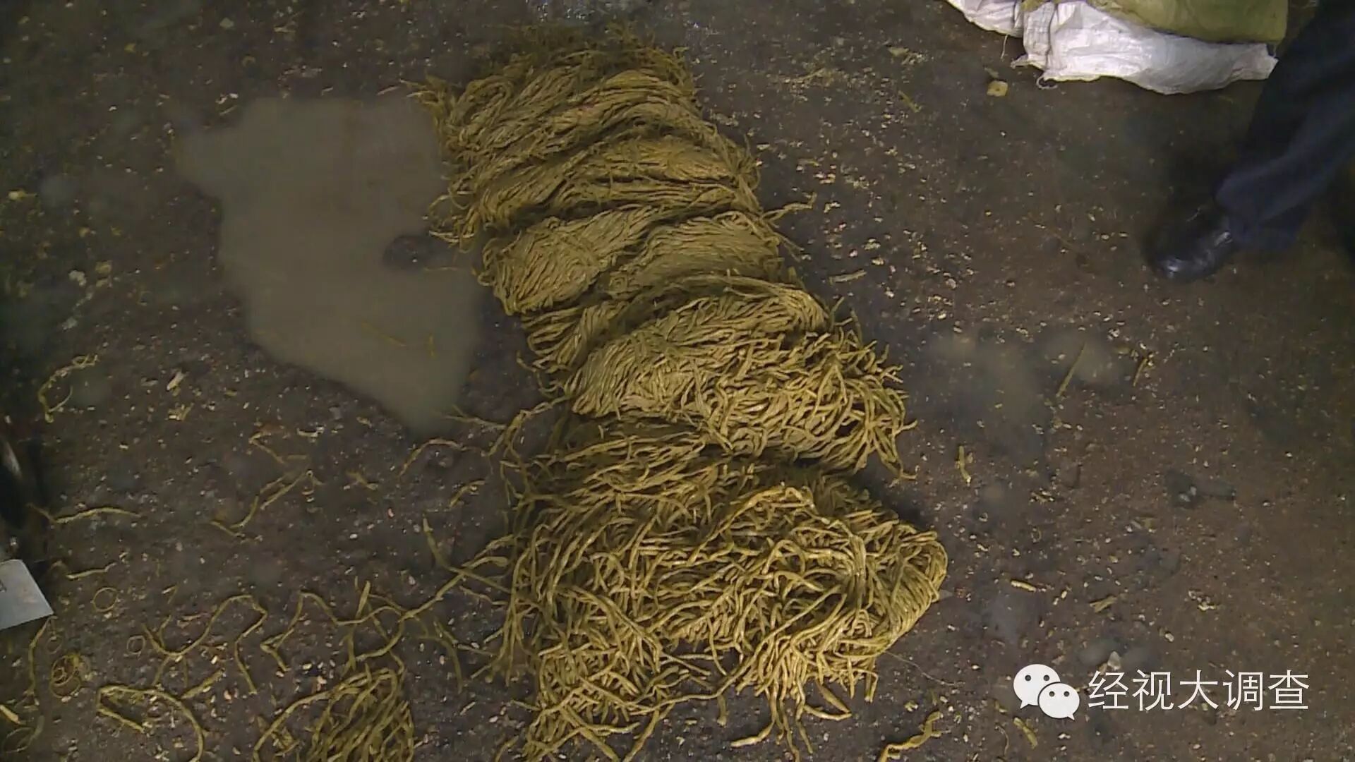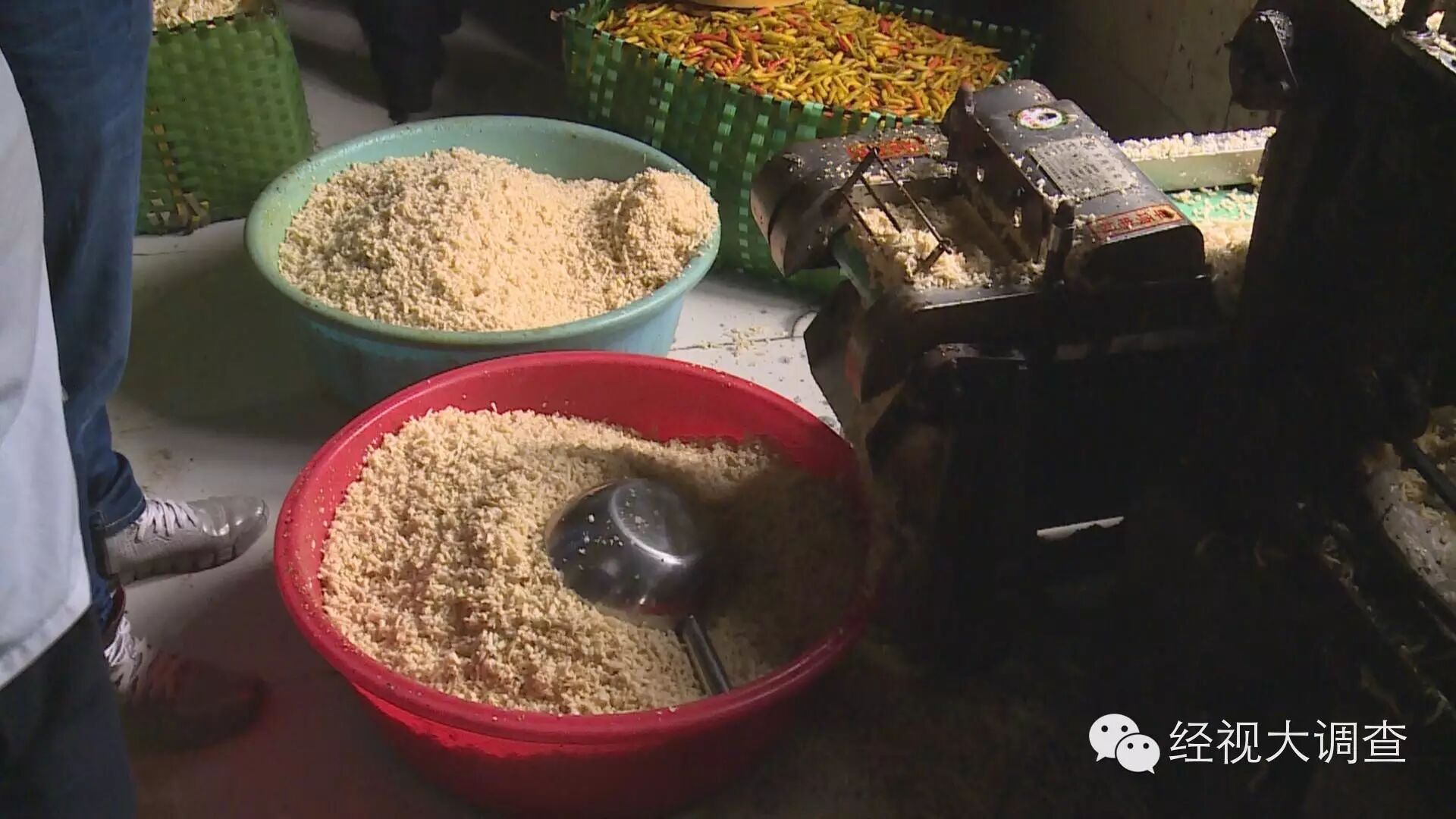 经视大调查记者在调查中发现,在长沙雨花区黎托街道的合丰村和花桥村存在着多个加工酸菜的黑作坊。记者和食药监执法人员来到花桥村的一家黑酸菜作坊。这里的生产环境同样是不堪入目。老板也无法提供采购原材料的相关票据,这家酸菜加工作坊也属于无证违规生产。