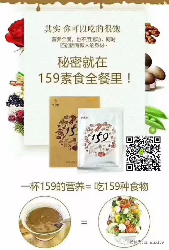 免责声明:如有版权异议及其他任何问题敬请及时告之,我们会立即删除或做其他妥善处理。159不是药,不问病,不治病。了解购买159素食请加微信:18901835933 159素食全餐是国家QS标准的食品,因能量餐内含有大量坚果类食材,对坚果类食材曾有严重过敏史的消费者慎用。