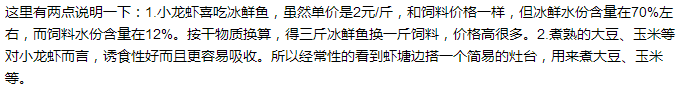 小龙虾是杂食性,偏肉食性动物。不管是新鲜的鱼块、冰鲜鱼等动物性饵料还是水草、黄豆、玉米、麦子等植物性饵料对小龙虾而言那都是美味。植物性蛋白中黄豆蛋白含量高,大约在40%左右,价格也高,维持在2.5元/斤。玉米、大麦蛋白含量低,一般是10%,价格也低一些,基本是1元/斤。新鲜的小鱼块、冰鲜鱼是动物性饵料,基本维持在2元/斤的水平。