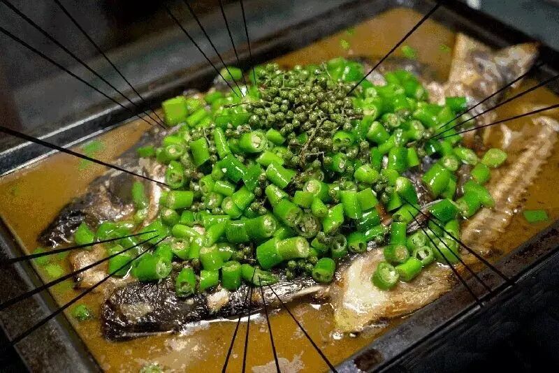 扒开层层青椒,里面都是白嫩紧实的鱼肉!
