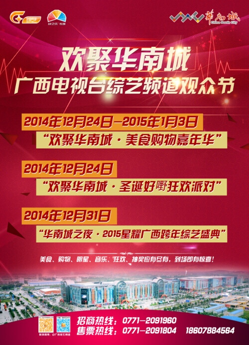 广西电视台综艺频道携手南宁华南城,从12月24日到2015年1月3日,举办“欢聚华南城广西电视台综艺频道观众节”。