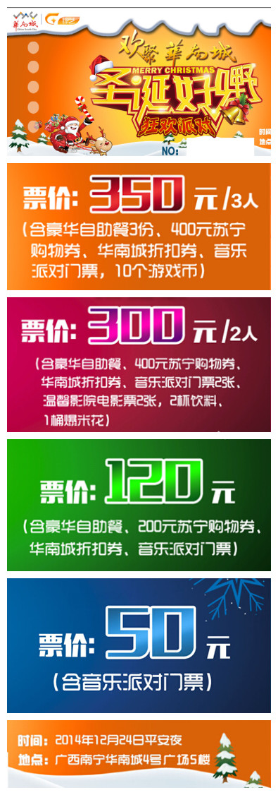三大主题文化活动:“欢聚华南城·美食购物嘉年华”、“欢聚华南城·圣诞好嘢狂欢派对”、“华南城之夜·2015星耀广西跨年综艺盛典”等你来HIGH!