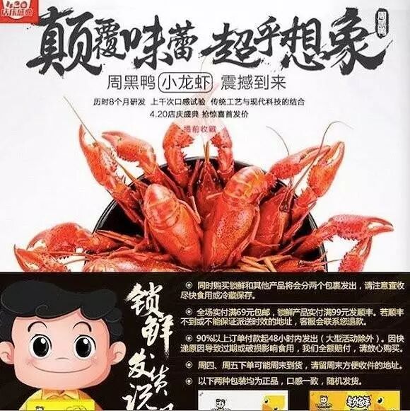 「夜宵 & 出差好伙伴」周黑鸭在这个夏天非常得意。今年五月,一向专注于卖鸭脖子的周黑鸭高调宣布:我们要卖小龙虾了!