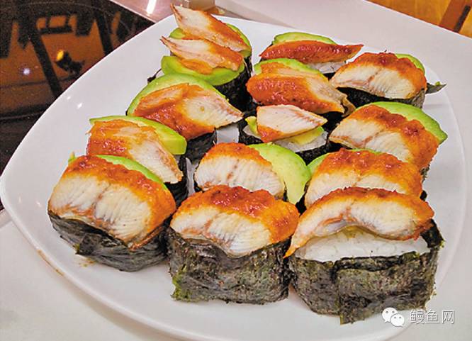 7. 将已定形之寿司饭铺上牛油果及鳗鱼缀上紫菜即成。