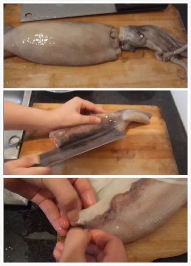 先将触须、吸盘上的吸钉搓洗掉,再把嘴里的两颗带钩子的牙齿挤出来,把墨鱼脊背上的脊背抽出来。