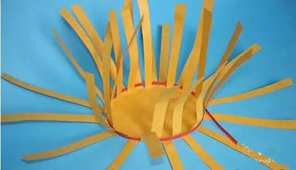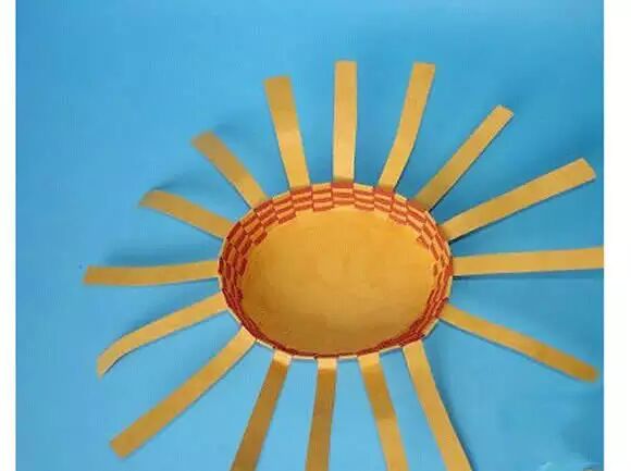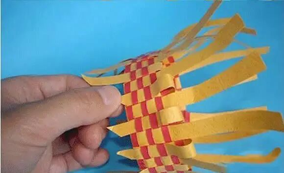 开始把红纸条放上去编织,仔细、耐心的编出小螃蟹的壳。