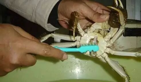 3. 抓住螃蟹的两边,用牙刷用力清洗背、腹和嘴部。然后清洗螃蟹的两侧及脚和钳的根部。