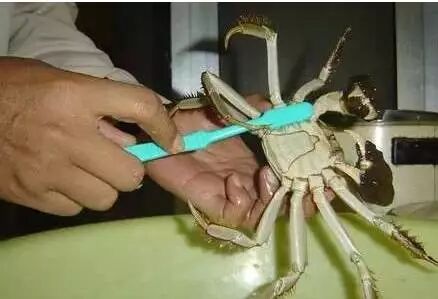 4.这里是最关键的一步,胆子小了可不行。抓住双钳(用牙刷柄从下向上挑起双钳的关节处,用抓蟹的拇指和食指顺势沿钳根向上用力抓住蟹钳。个别凶猛的螃蟹可先向下压几下钳子或敲打几下)打开腹盖,在中间从里向外挤出排泄物。