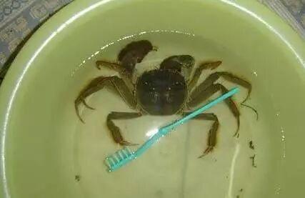 2.放入要清洗的螃蟹,不要担心螃蟹会到处乱跑,它会钻进水里。有个别螃蟹会跑出来,把它抓住或赶进水里就行了,一会就安静了。浸泡十分钟左右就可清洗了。