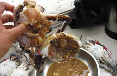 而针眼蟹买回家,拿锅一煮,当你想享受美味打开蟹壳的时候,会有很多特别咸的海水流出,最多能流出半个盘子那么多,整个蟹黄或是蟹膏已经被海水泡了太长时间,被蒸汽一煮,早就变成黄汤了。