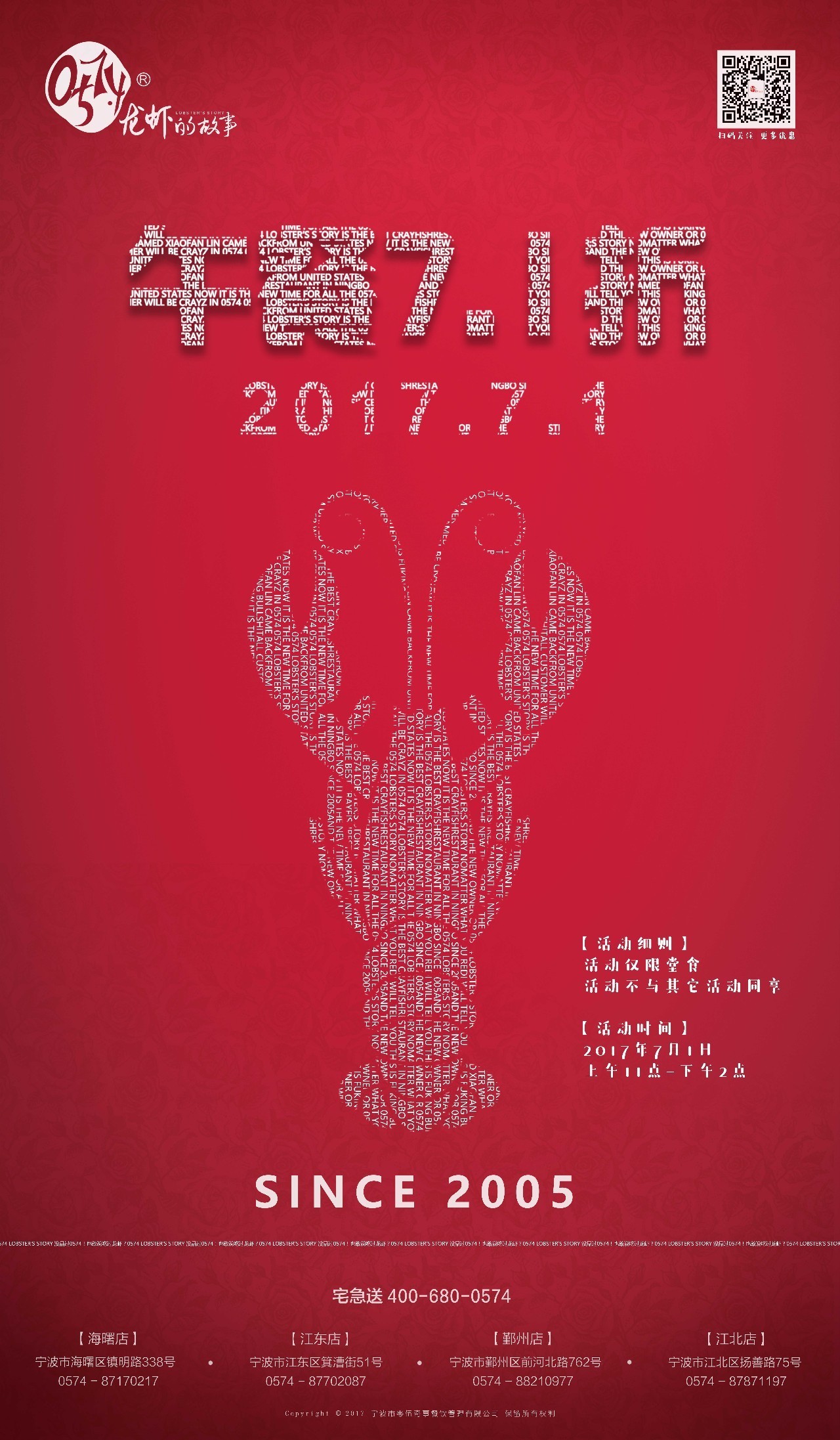 为了庆祝CCTV两度造访,当初的那个小屁孩如今的少东家放话,就在本周六7月1日,0574龙虾的故事所有门店中餐7.1折(2017年7月1日,中餐11点至14点,全场7.1折,仅含堂食,其他活动不可同时使用,更多详情可咨询少东家)