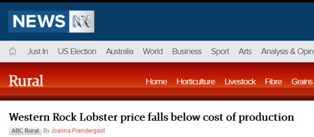 Geraldton地区的龙虾捕捞者Peter Bailey在接受采访时表示,目前澳洲大龙虾出现供应过剩的局面,导致价格全!面!暴!跌!