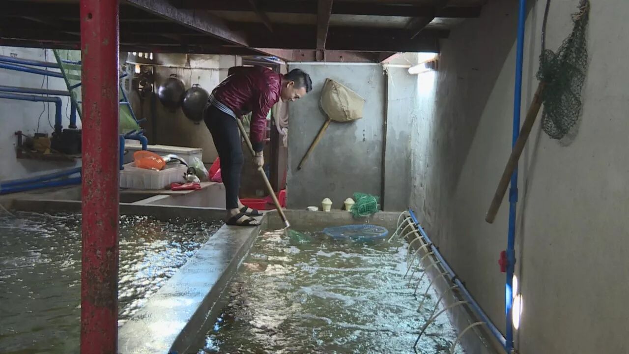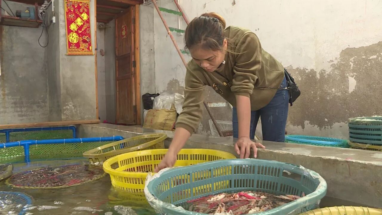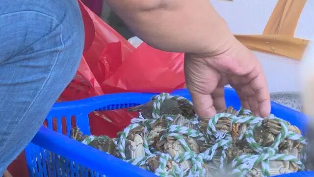 (在这里经营5年的商户陈小玲,在整理和分类刚送来的螃蟹)