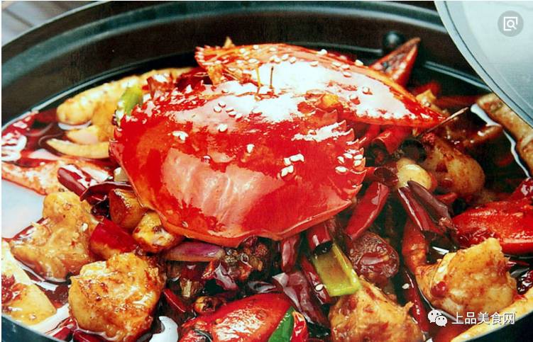 3、锅内另加油,烧至四成油温,投入干辣椒节,花椒炒香,掺入鲜汤,略烧片刻,再下姜、葱蒜、海蟹,最后放入精盐、料酒、海鲜酱、鸡精烧约2分钟后,用水淀粉收薄芡,最后加入香油、花椒油、辣椒油、胡椒粉翻匀即可装盘。