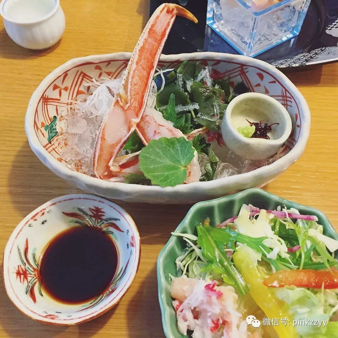接着来了刺身和沙拉,还行,反正摆盘精美,是吧,看起来很多的样子呢,其实吃的也就一只腿罢了。第一次吃蟹腿刺身,吃起来软软的口感,沙拉是真好吃。