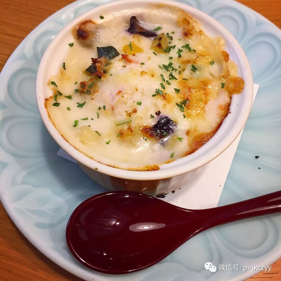 紧跟而来的也是一道烤的菜,这个菜译过来是奶汁烤蟹,感觉有点不通,但又不知道怎么叫比较好了,无语。里面浓浓的奶味,特别香,而且吃完都不腻的,可能还是因为有点少吧(ok。