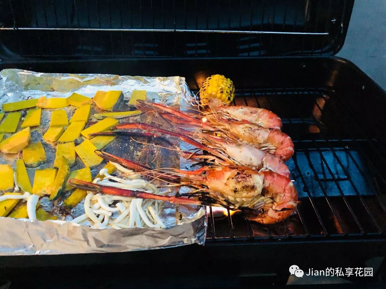 烤大虾,南瓜,蘑菇和玉米。