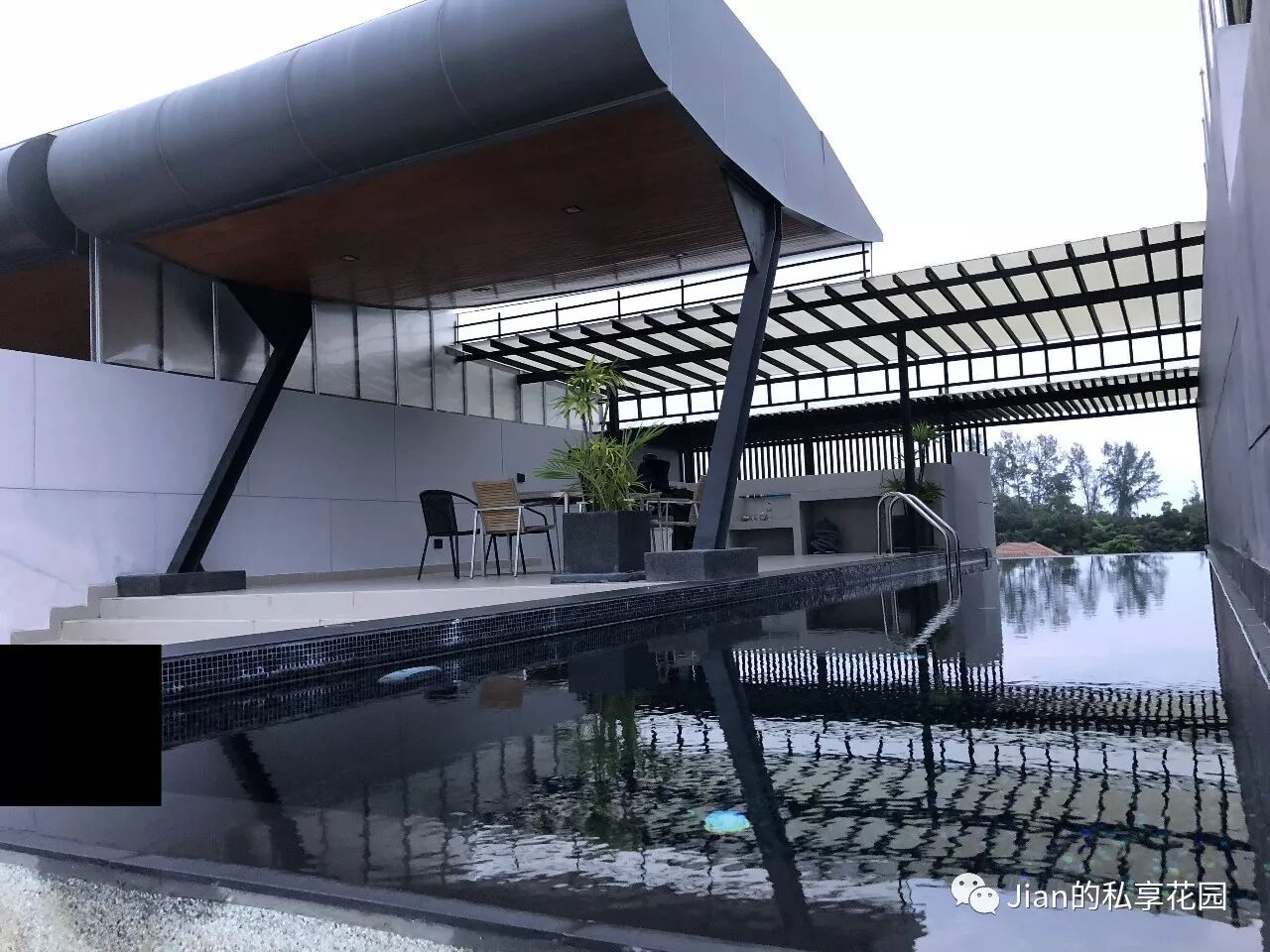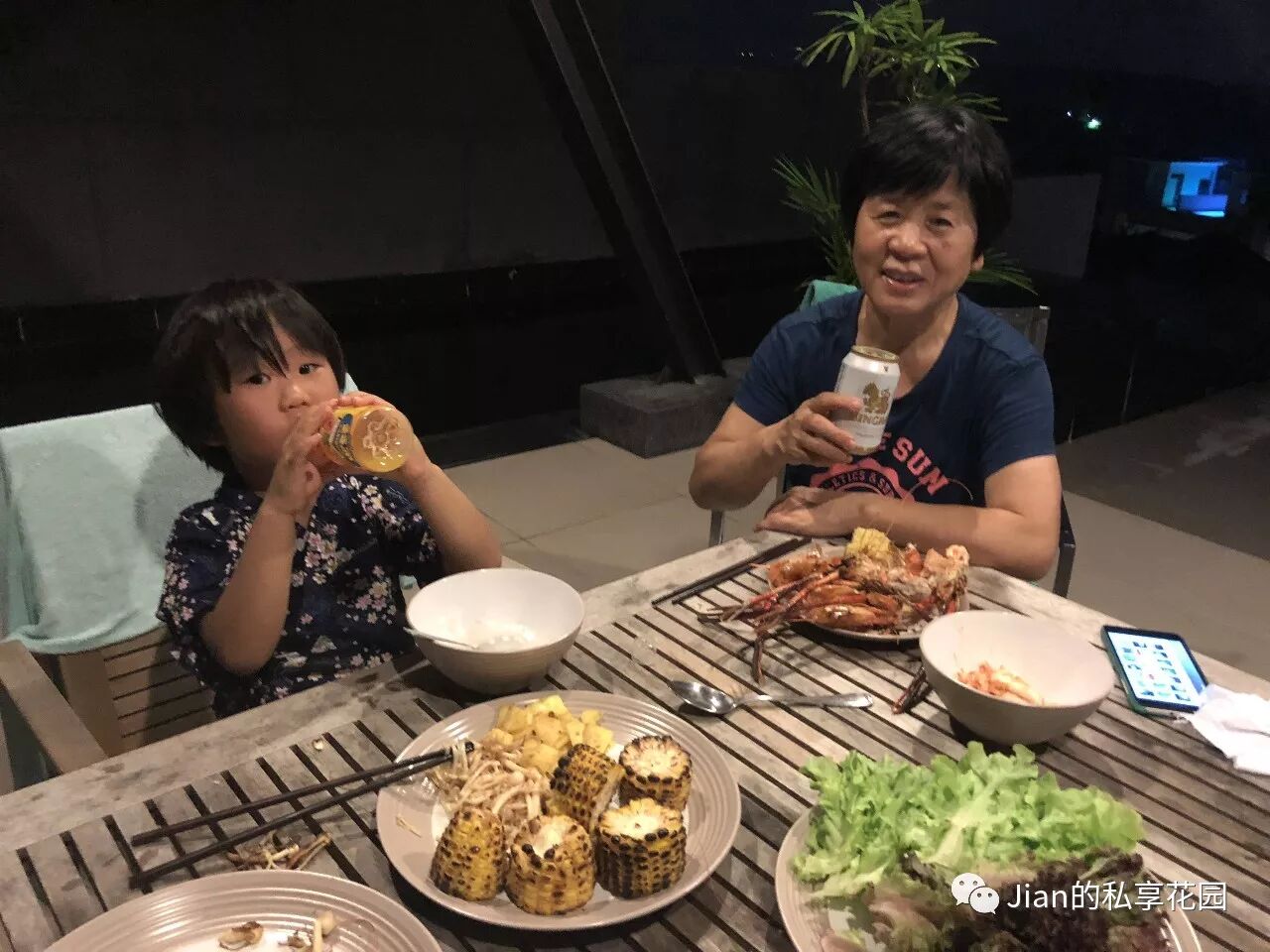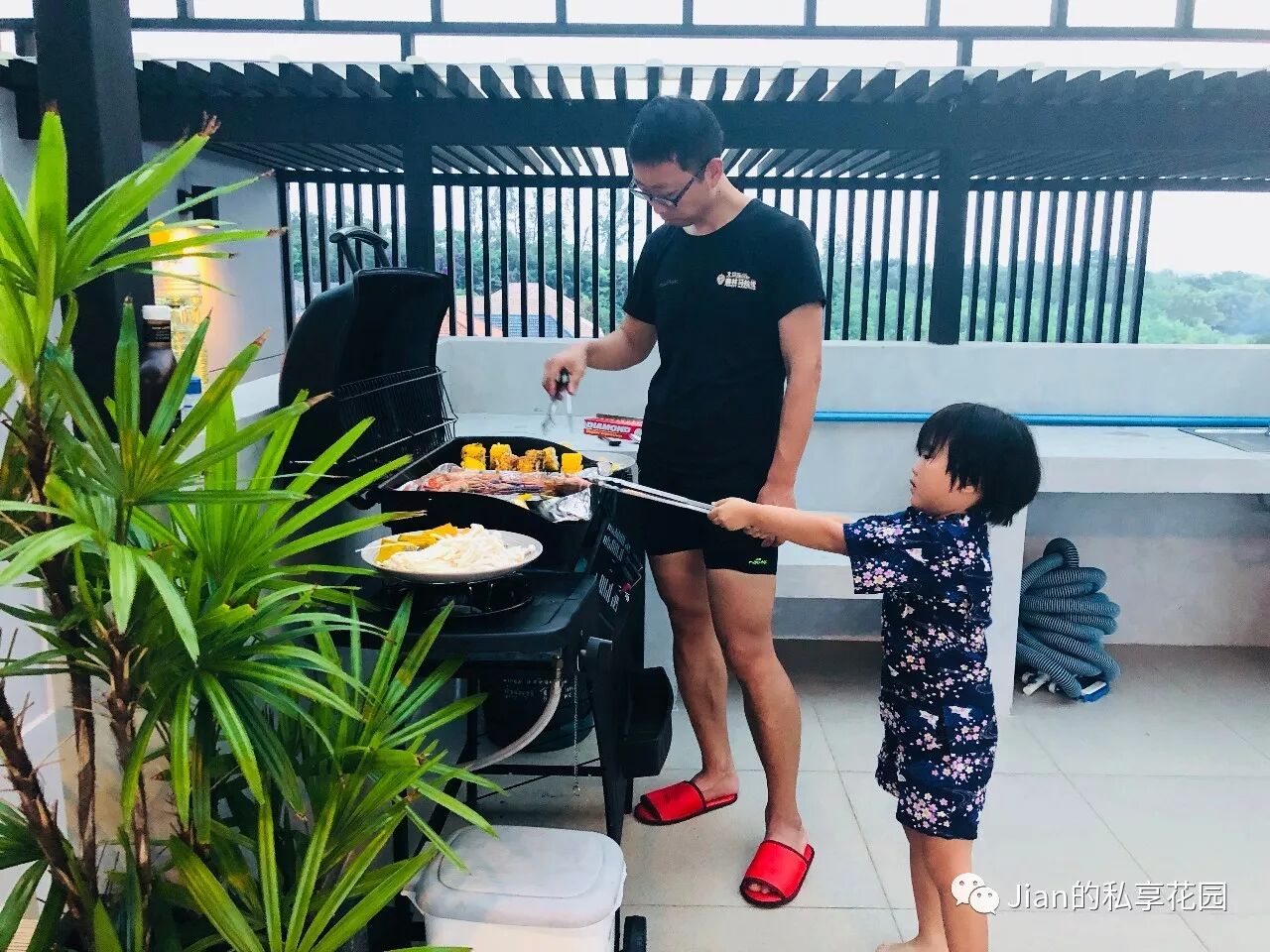 晚上就在楼顶的露天泳池边上烧烤啦。