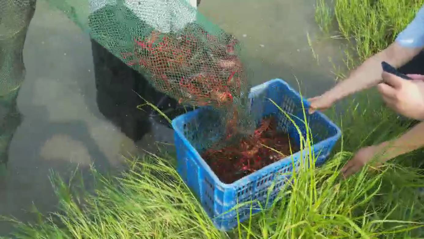 小强来到了华山虾稻共殖养殖基地,了解了小龙虾的养殖过程及情况。