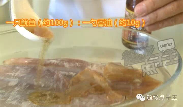 一只大约100克的干鱿鱼,只要在正好没过鱿鱼的清水中加入一勺约10克的香油就可以了!