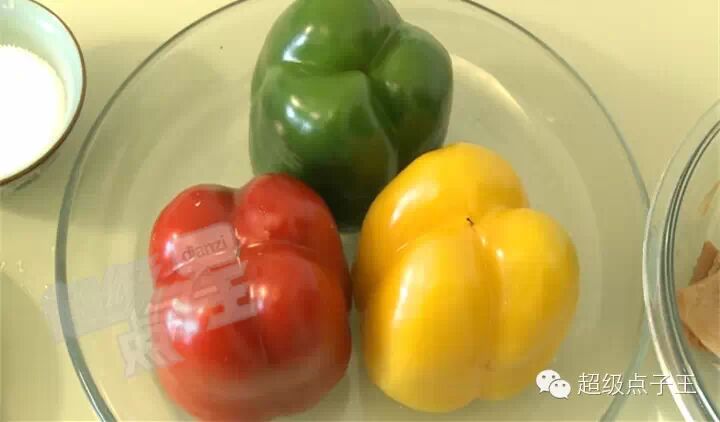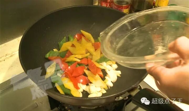 ▶然后把彩色灯笼椒倒下去,炒两分钟。