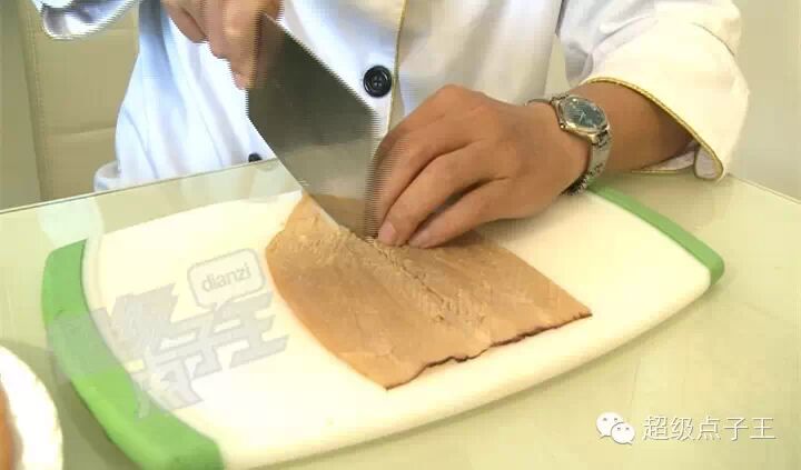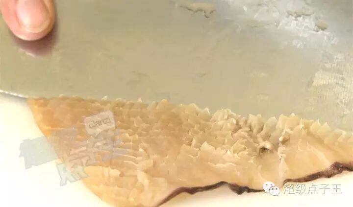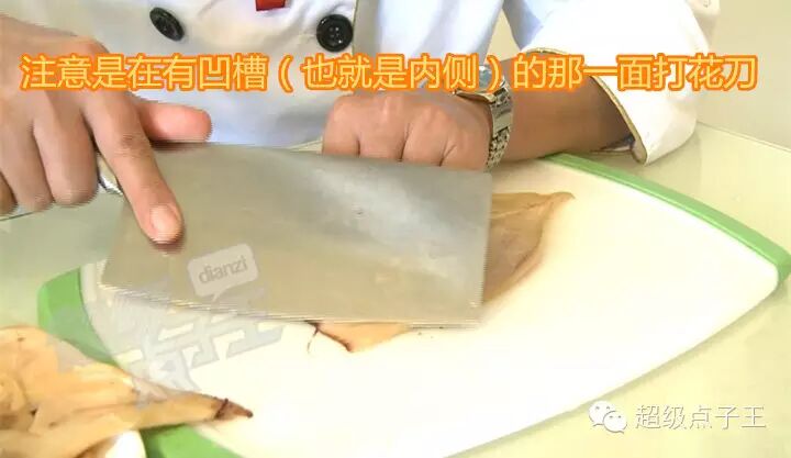 ▶给鱿鱼打花刀,在鱼身中间有凹槽的一面,也就是鱿鱼内侧这一面斜刀切,纵横交叉,切十字花刀就好了。注意,是切鱿鱼内侧面,切反了鱿鱼炒出来是不出花的。
