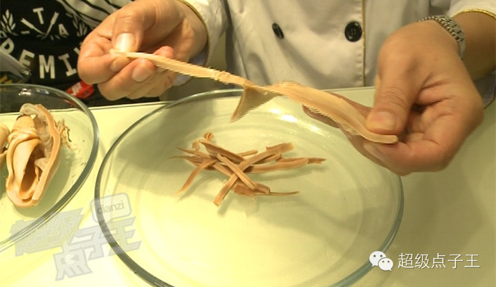 ▶然后,我们把烫熟的鱿鱼撕成条状,放到盘里备用