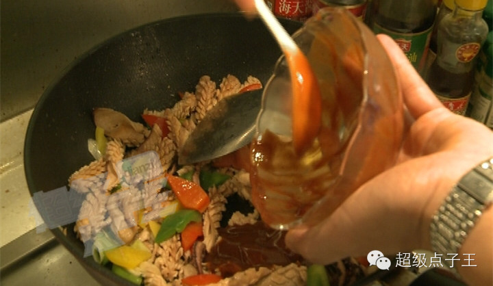 ▶最后,我们淋入事先调好的酱汁。继续翻炒,酱汁稍微收干,我们就可以起锅装盘啦。