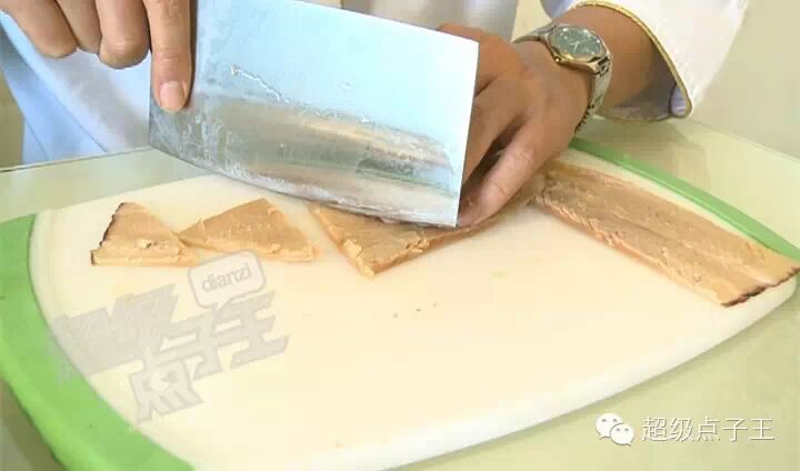 ▶打完花刀的鱿鱼在中间一分为二,然后切成三角形片状,这样焯水后才能开出像麦穗一样的花。