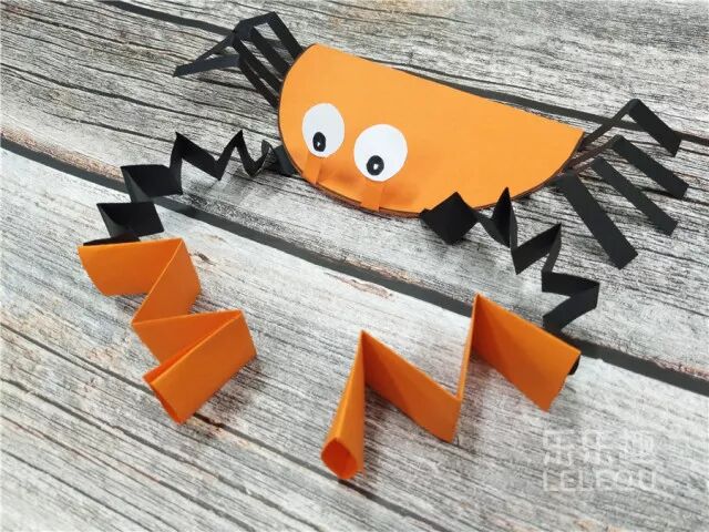 6、将做好的橙色纸条折叠成图中的样子,剪掉多余的部分。将黑色的纸条和橙色的夹子粘起来,然后整体粘在螃蟹身体的两边。