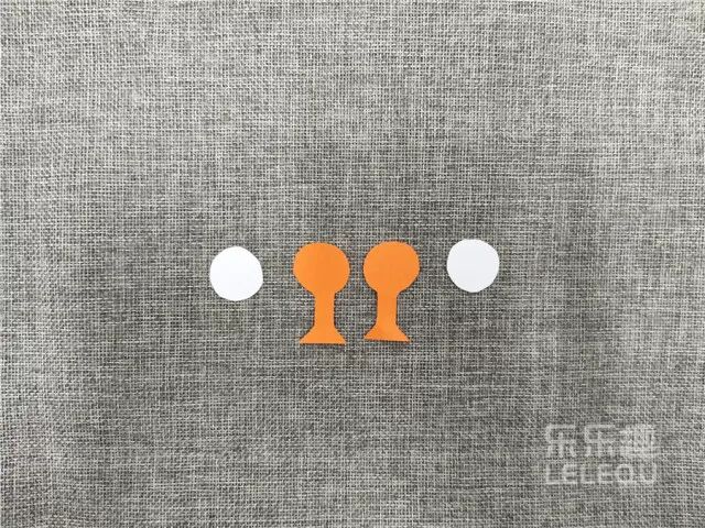 7、接下来,我们要做螃蟹的眼睛。剪出两个白色的小圆片,还有橙色的眼睛部件。将白色小圆片贴在橙色的眼睛部件上。用黑色的彩笔画出眼珠子。