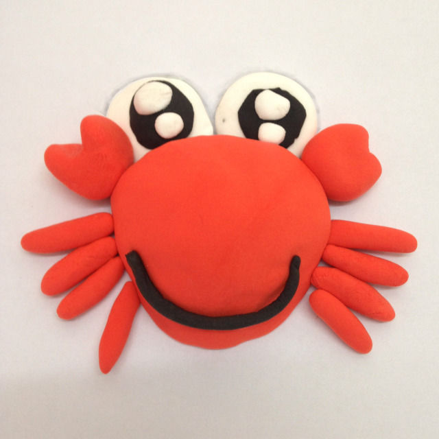 将大钳子、眼睛、蟹腿粘到蟹壳周围,用黑色彩泥搓出一条细长条,