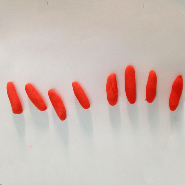 取混合后的彩泥,用搓的方法制作蟹腿,8条蟹腿的长短和粗细要一样。