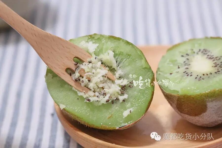 对半切,拿勺子叉子刮刮刮,每一口都是新鲜的猕猴桃冰沙~