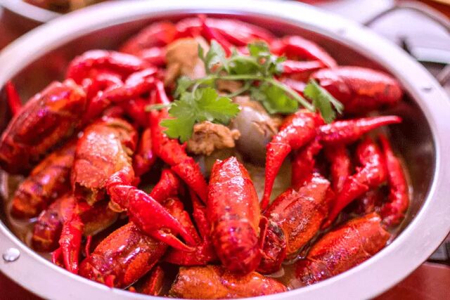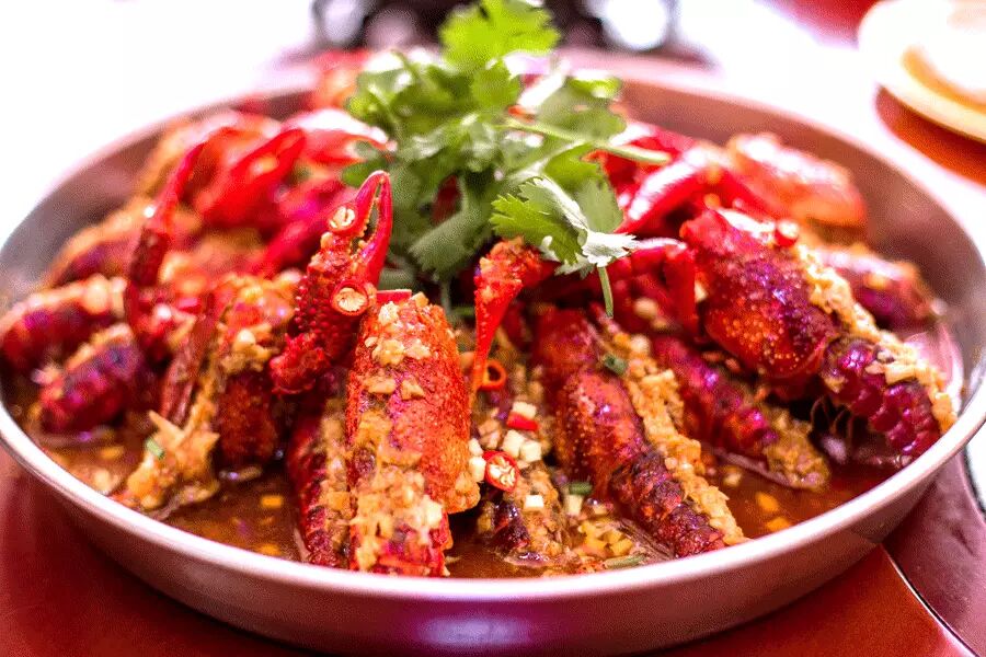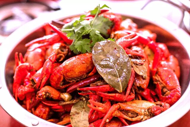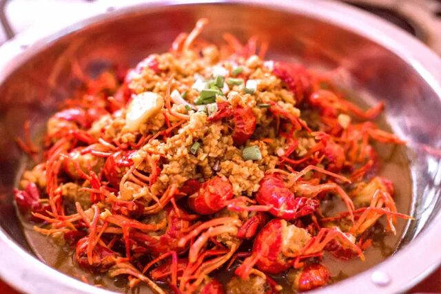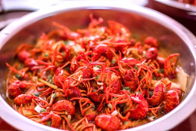 【油焖虾】把虾虾们聚在一起烹饪装盆,色泽枣红亮丽,因为是先炒制再焖煮,里面的虾肉有了清油以及秘制酱料的味道,味香飘逸,鲜嫩微甜,油润适口,不愧是招牌佳肴!
