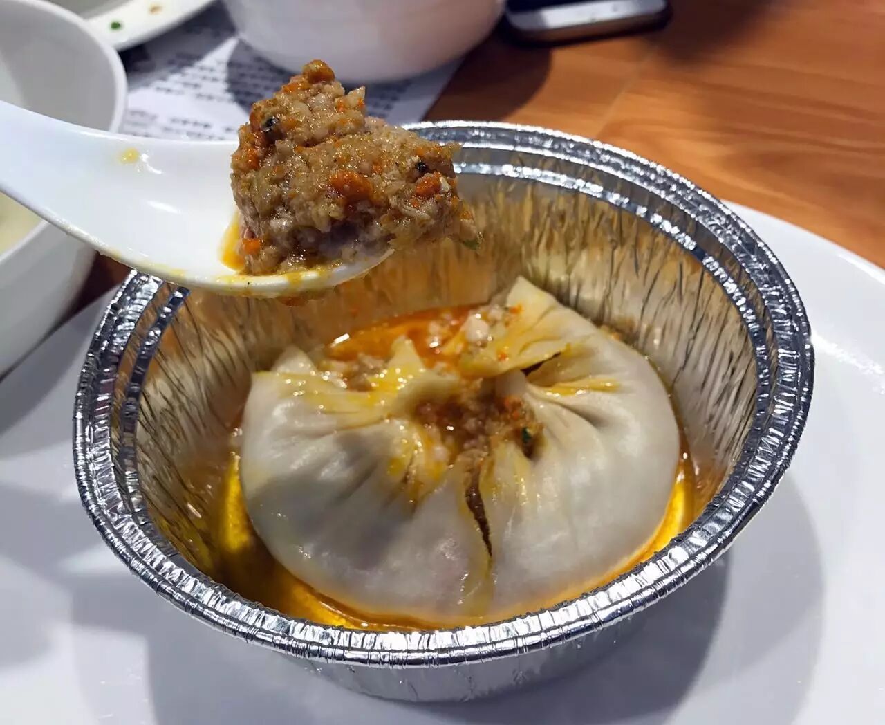用勺子瓦一口,橙红色的蟹油瞬间溢出来,肉馅非常紧实,店家很实在,用了相当多的蟹粉,每一口都那么满足。