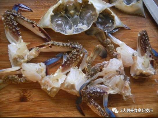 处理螃蟹 : 螃蟹洗净开壳后, 每只切成四块。加入料酒, 盐, 生粉 拌匀。