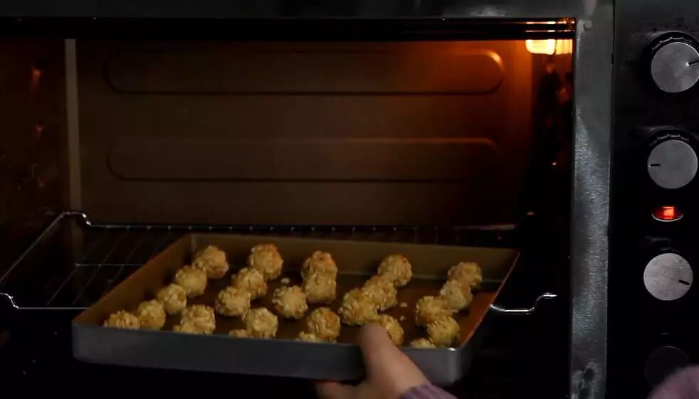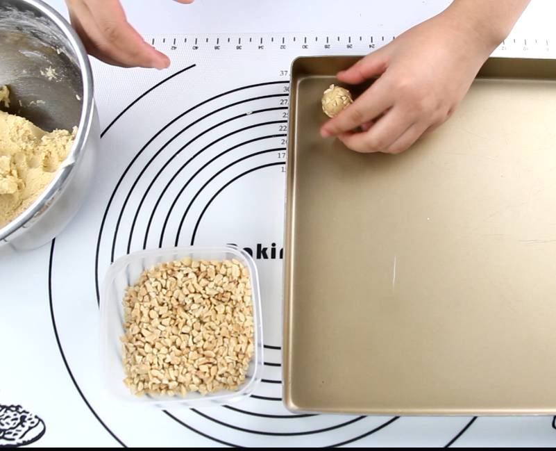 取适量面团搓圆,沾上蛋液滚上花生碎,摆入烤盘中。