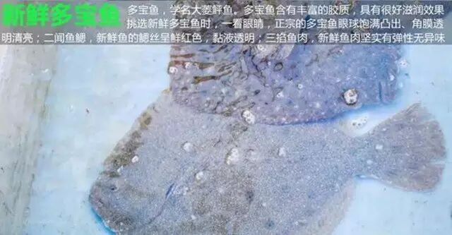 多宝鱼,学名大菱鲆鱼。多宝鱼含有丰富的胶质,具有很好的滋润效果。挑选多宝鱼时,一看眼睛,正宗的多宝鱼眼球饱满凸出、角膜透明清亮;二闻鱼鳃,新鲜鱼的鳃丝呈现鲜红,黏液透明;三掐鱼肉,新鲜鱼肉坚实有弹性无异味。