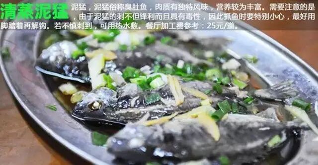 泥猛俗称臭肚鱼,肉质有独特风味,营养丰富。需要注意的是,由于泥猛的刺不但锋利而且具有毒性,因此抓鱼时要特别小心,最好用脚踩住再解钩。若不慎被刺到,可用热水敷。