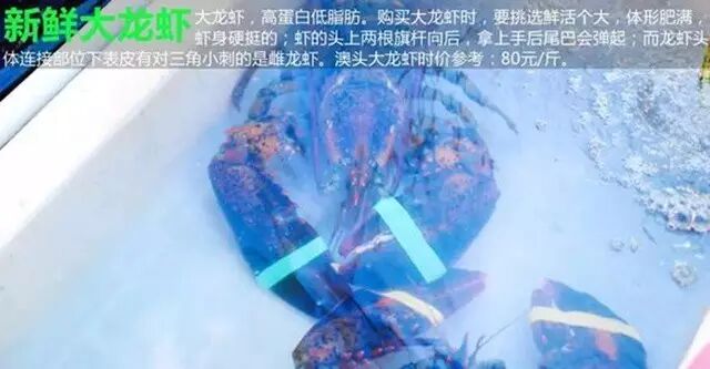 大龙虾,高蛋白低脂肪。购买大龙虾时,要挑选鲜活个大,体形肥满,虾身硬挺的。虾的头上两根旗杆向后,拿上手后尾巴会弹起,而龙虾头体连接部位下表皮有对三角小刺的是雌龙虾。
