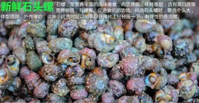 石螺,是营养丰富的风味美食,肉质爽脆,味鲜香甜,含有蛋白质等营养物质,有健胃、促进食欲的功能。挑选石头螺时,要选个头大,体型圆润,外壳薄的;此外,挑选时可以用手指往掩片上轻轻压下,有弹性的是活螺。
