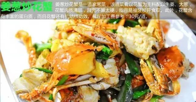 姜葱炒花蟹是一道家常菜,该道菜肴以花蟹为主料配以生姜、大葱,花蟹肉质清甜,且壳不算太硬,能容易被牙咬开食取。此外,花蟹含有丰富的蛋白质,而且花蟹还有抗结核功效。