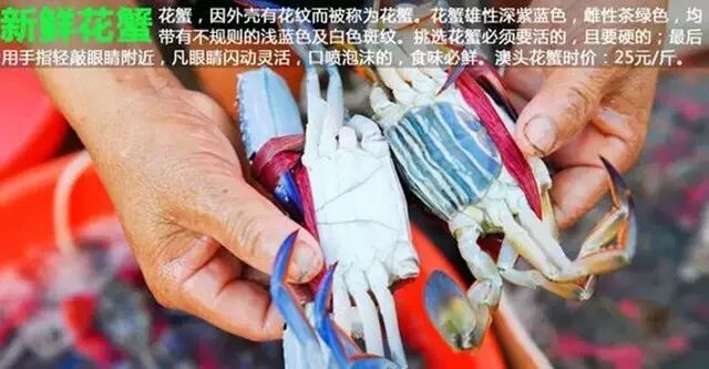 花蟹,因外壳有花纹而被称为花蟹。花蟹雄性紫蓝色,磁性茶绿色,均用手指轻敲眼睛附近,凡眼睛闪动灵活,口喷泡沫的,食味必鲜。