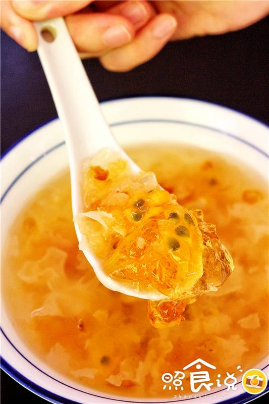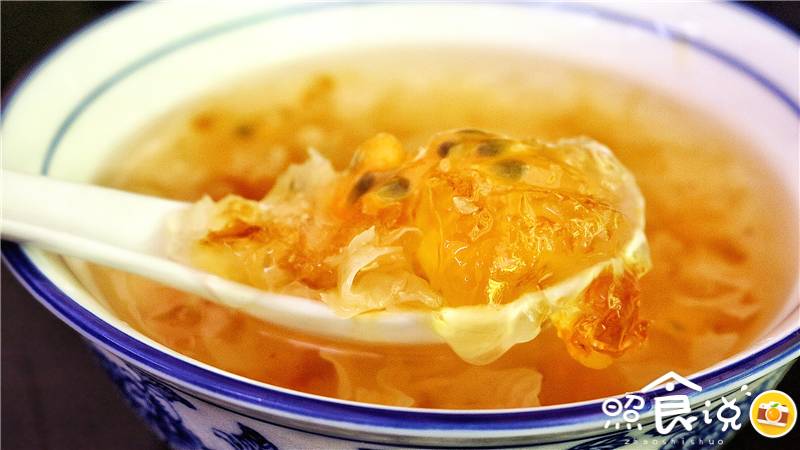▲看起来稀稀的,那只是碗比较大,但用料一点不含糊。银耳爽脆,桃胶Q弹滑嫩,还特别加了一勺百香果肉,有点酸溜。