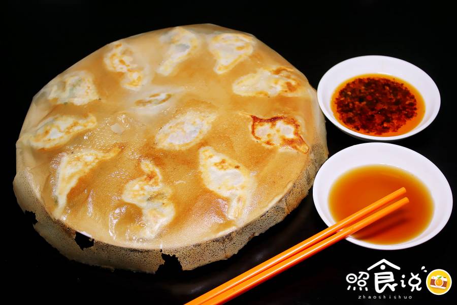▲最后起锅前再下油,“窗花”起酥变焦黄,就可以收火,一个倒扣、装盘!这样自然就形成一饼顶着金黄薄脆的锅贴~