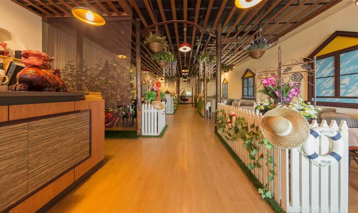 吊篮装饰、木质栏杆,精致典雅的装修风格,让每一位在此就餐的客人都能全身心地投入到对美食的享受之中。无论是情侣约会,商务聚会,还是生日party,在石门小镇,都会让你不虚此行。