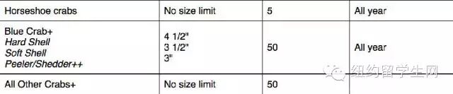 a. 纽约州规定,每人每天钓螃蟹数量不能超过50只,蓝蟹(Blue Crab)不能小于4.5英寸(4 1/2" inches)——也就是螃蟹壳小于11.43厘米的必须放生,产子的母螃蟹必须放生。还有一种蓝蟹叫脱壳蟹(Peeler crab)不能小于3 英寸(7.62厘米),但是一般我们辨别不出来,所以为了保险起见,只抓大的螃蟹就好。